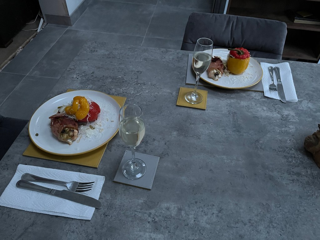 Chicken wrapped in bacon with stuffed peppers 😋